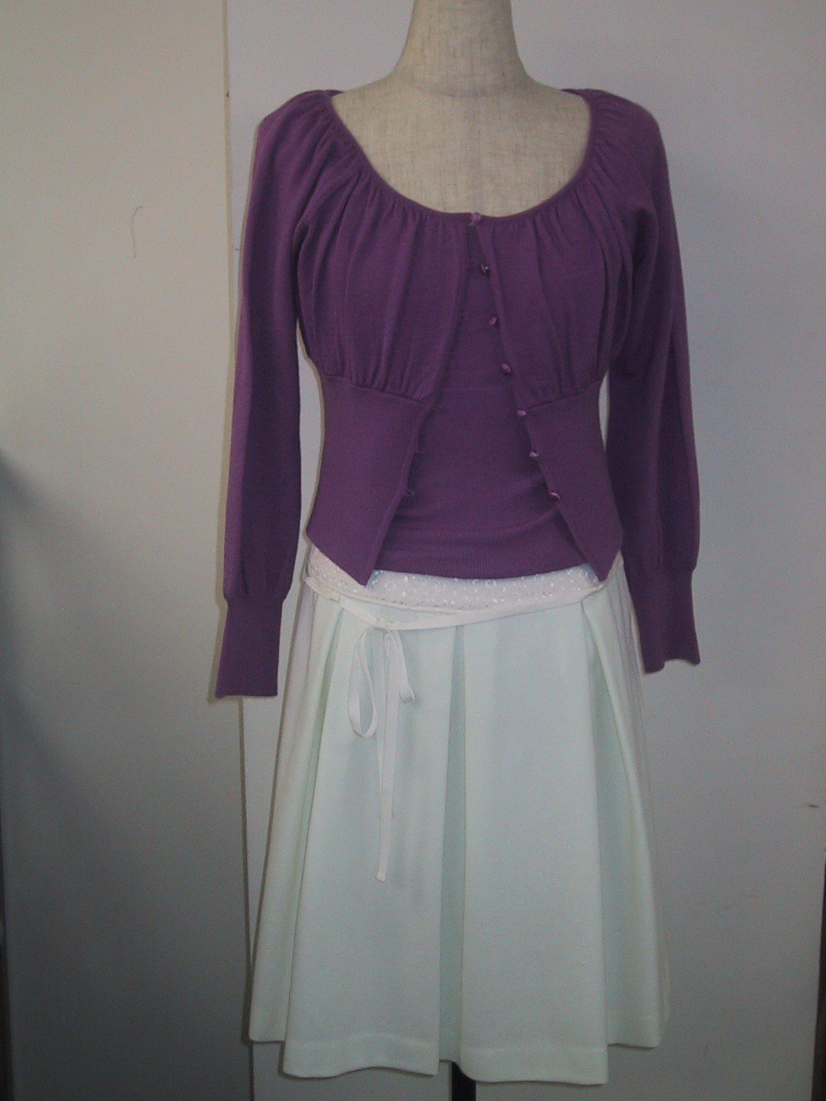 ニットカーディガンとグレーのリボン付ボックスプリーツスカートを着用してくれました。